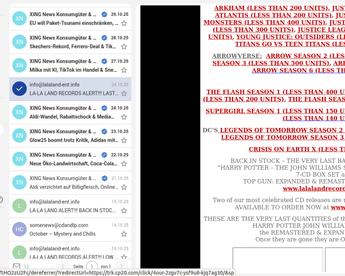 2. Stimmt, das Angebot ist da - aber: bspw. bei Flash Vol. 1 hätte der Link doch dahin führen sollen: https://lalalandrecords.com/flash-the-season-1-limited-edition-2-cd-set/?searchid=546776&search_query=flash und nicht zu einem trk.cp20.com-Link wie bei der Abbildung? Die E-Mail Adresse ist aber formal korrekt. https://lalalandrecords.com/contact-us/