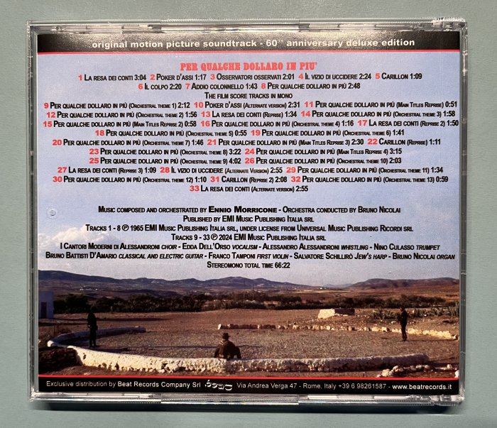 Beat Records Company Publishing Group in collaboration with Universal Music Publishing Ricordi and Emi Music Publishing is proud to present the complete edition of the 60th anniversary of the original motion picture soundtrack of the second movie of The Dollars Trilogy, For a Few Dollars More, featuring the score by Ennio Morricone. One of the most waited scores by the Maestro fans, and from Sergio Leone’s cinema and music lovers, a project that finally is born thanks to the finding of the score in Beat Records archives, right in time to celebrate the 60th year of life of this cinematic masterpiece by Sergio Leone with Clint Eastwood, Lee Van Cleef and Gian Maria Volontè.