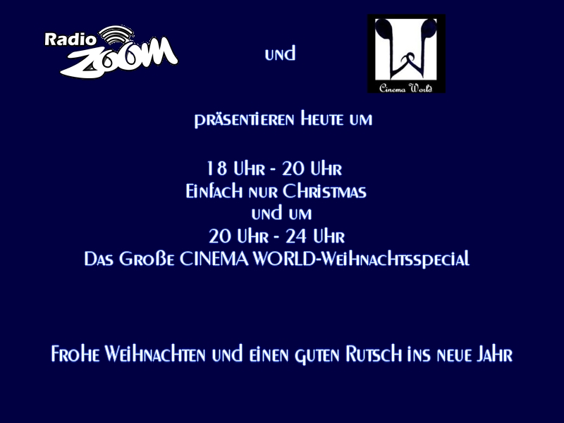 Heute wird es wieder sehr besinnlich in der Cinema World-Familie... Die ENF heißt heute ENW (Einfach nur Weihnachten) und die USS.Cinema World wurde kurzerhand mit ein paar Lichterketten behängt und strahlt für das große Weihnachtsspecial mit den Sternen um die Wette. Für Punsch und Plätzchen ist gesorgt, also schaltet um 18 Uhr RADIO ZOOM ein und lasst euch mehr als vier Stunden verzaubern vom romantischsten, süßesten und besinnlichsten was die Filmmusik zu bieten hat!